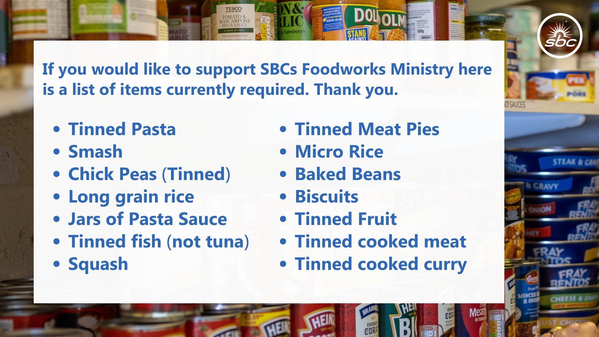 SBC Foodworks supports individuals and families in crisis by providing essential food and toiletry parcels, typically lasting up to a week. These parcels are made possible through generous donations from church members, local schools, and financial supporters.